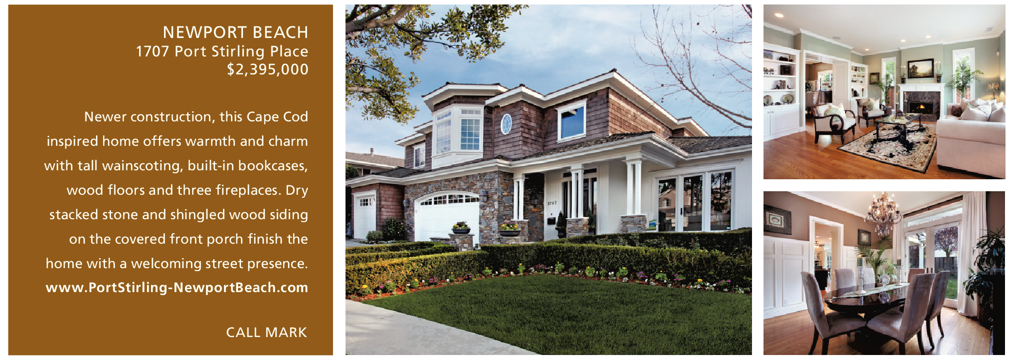 Newer construction, this Cape Cod inspired home offers warmth and charm with tall wainscoting, built-in bookcases, wood floors and three fireplaces. Dry stacked stone and shingled wood siding on the covered front porch finish the home with a welcoming street presence. www.PortStirling-NewportBeach.com