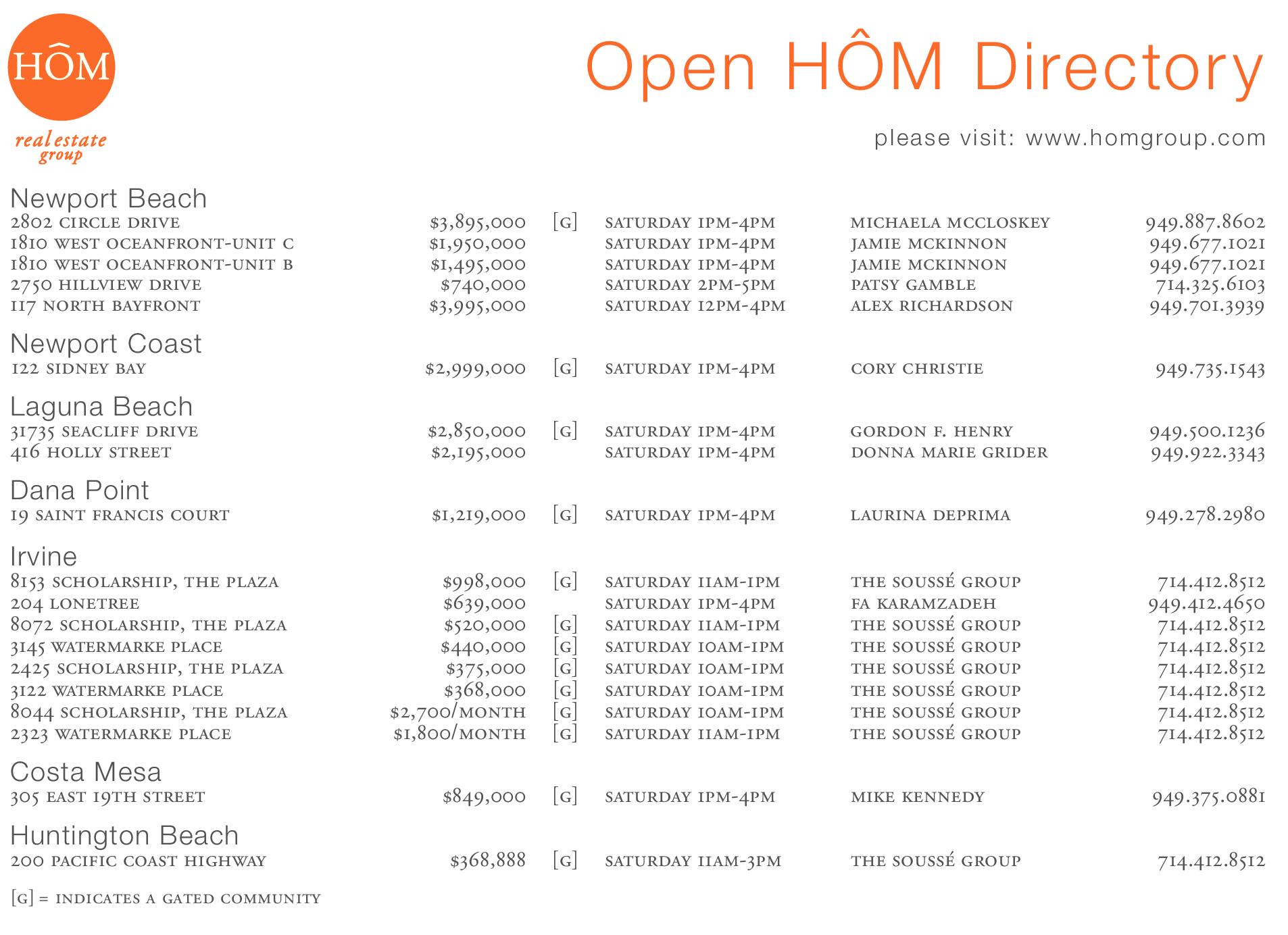 2802 circle drive $3,895,000 [g] saturday 1pm-4pm michaela mccloskey 949.887.8602 1810 west oceanfront-unit c $1,950,000 saturday 1pm-4pm jamie mckinnon 949.677.1021 1810 west oceanfront-unit b $1,495,000 saturday 1pm-4pm jamie mckinnon 949.677.1021 2750 hillview drive $740,000 saturday 2pm-5pm patsy gamble 714.325.6103 117 north bayfront $3,995,000 saturday 12pm-4pm alex richardson 949.701.3939
