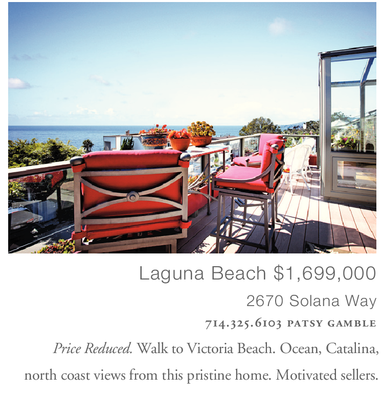 Laguna Beach $1,699,000 2670 Solana Way 714.325.6103 patsy gamble Price Reduced. Walk to Victoria Beach. Ocean, Catalina, north coast views from this pristine home. Motivated sellers.
