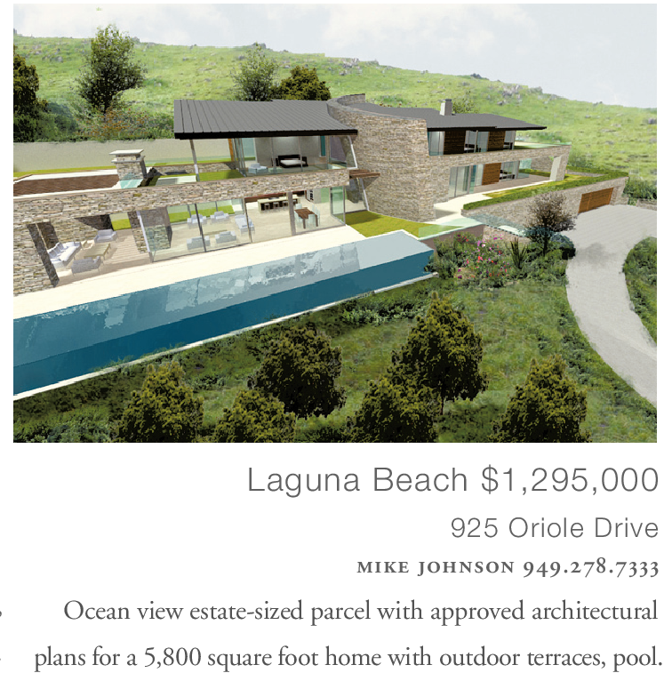 Laguna Beach $1,295,000 925 Oriole Drive mike johnson 949.278.7333 Ocean view estate-sized parcel with approved architectural plans for a 5,800 square foot home with outdoor terraces, pool.