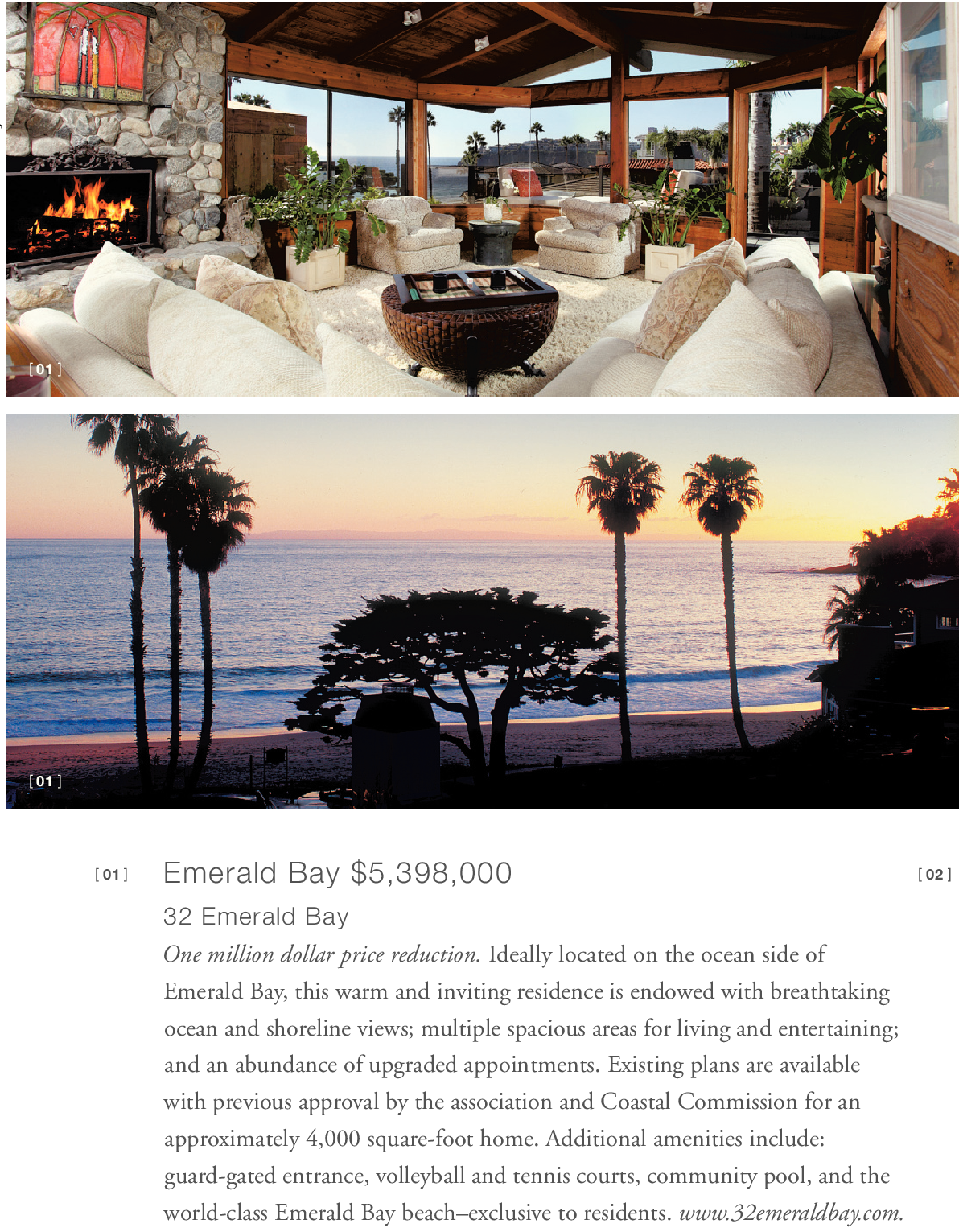 32 Emerald Bay One million dollar price reduction. Ideally located on the ocean side of Emerald Bay, this warm and inviting residence is endowed with breathtaking ocean and shoreline views; multiple spacious areas for living and entertaining; and an abundance of upgraded appointments. Existing plans are available with previous approval by the association and Coastal Commission for an approximately 4,000 square-foot home. Additional amenities include: guard-gated entrance, volleyball and tennis courts, community pool, and the world-class Emerald Bay beach–exclusive to residents. www.32emeraldbay.com.