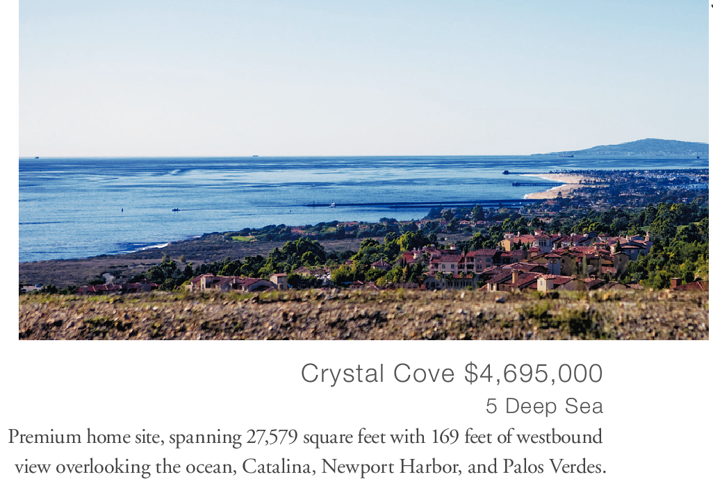 5 Deep Sea Premiumhomesite,spanning27,579squarefeetwith169feetofwestbound view overlooking the ocean, Catalina, Newport Harbor, and Palos Verdes.