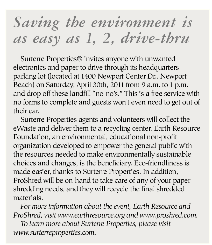 Surterre Properties® invites anyone with unwanted electronics and paper to drive through its headquarters parking lot (located at 1400 Newport Center Dr., Newport Beach) on Saturday, April 30th, 2011 from 9 a.m. to 1 p.m. and drop off these landfill “no-no’s.” This is a free service with no forms to complete and guests won’t even need to get out of their car.