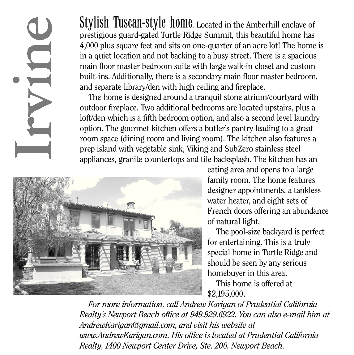 For more information, call Andrew Karigan of Prudential California Realty’s Newport Beach office at 949.929.6922. You can also e-mail him at AndrewKarigan@gmail.com, and visit his website at www.AndrewKarigan.com. His office is located at Prudential California Realty, 1400 Newport Center Drive, Ste. 200, Newport Beach.