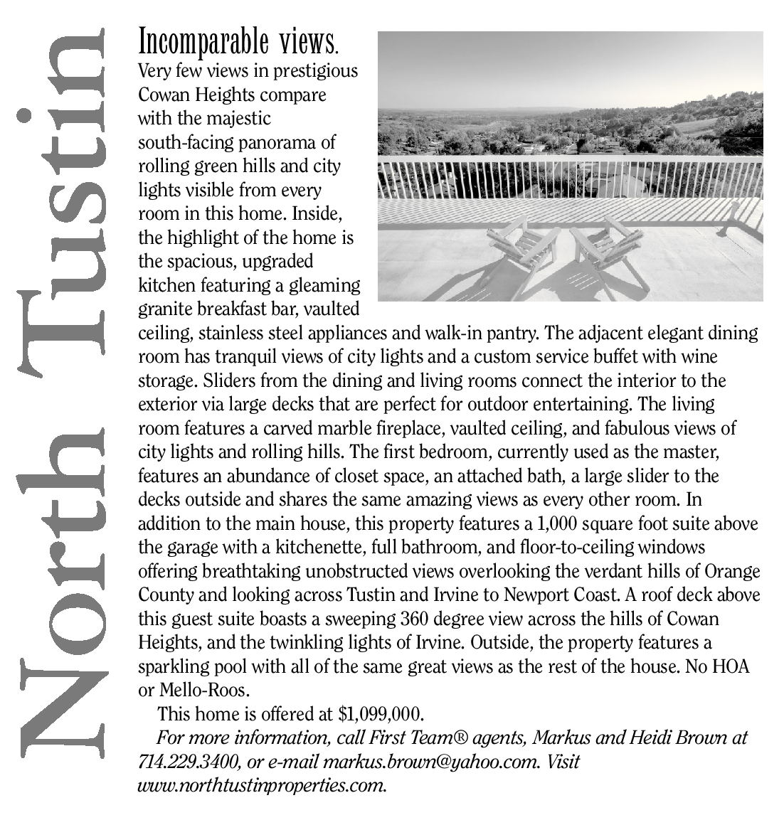This home is offered at $1,099,000. For more information, call First Team® agents, Markus and Heidi Brown at 714.229.3400, or e-mail markus.brown@yahoo.com. Visit www.northtustinproperties.com.