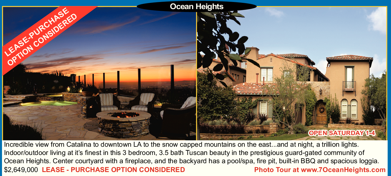 Incredible view from Catalina to downtown LA to the snow capped mountains on the east...and at night, a trillion lights. Indoor/outdoor living at it’s finest in this 3 bedroom, 3.5 bath Tuscan beauty in the prestigious guard-gated community of Ocean Heights. Center courtyard with a fireplace, and the backyard has a pool/spa, fire pit, built-in BBQ and spacious loggia. $2,649,000 LEASE - PURCHASE OPTION CONSIDERED Photo Tour at www.7OceanHeights.com