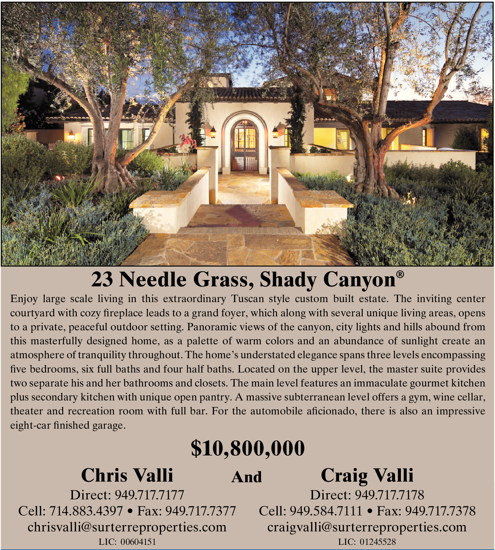 23 Needle Grass, Shady Canyon ® Enjoy large scale living in this extraordinary Tuscan style custom built estate. The inviting center courtyard with cozy fireplace leads to a grand foyer, which along with several unique living areas, opens to a private, peaceful outdoor setting. Panoramic views of the canyon, city lights and hills abound from this masterfully designed home, as a palette of warm colors and an abundance of sunlight create an atmosphere of tranquility throughout. The home’s understated elegance spans three levels encompassing five bedrooms, six full baths and four half baths. Located on the upper level, the master suite provides two separate his and her bathrooms and closets. The main level features an immaculate gourmet kitchen plus secondary kitchen with unique open pantry. A massive subterranean level offers a gym, wine cellar, theater and recreation room with full bar. For the automobile aficionado, there is also an impressive eight-car finished garage. $10,800,000 Chris Valli Direct: 949.717.7177 Cell: 714.883.4397 • Fax: 949.717.7377 chrisvalli@surterreproperties.com LIC: 00604151 And Craig Valli Direct: 949.717.7178 Cell: 949.584.7111 • Fax: 949.717.7378 craigvalli@surterreproperties.com LIC: 01245528