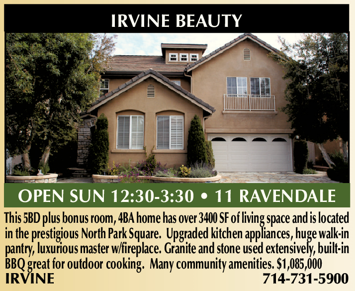 IRVINE BEAUTY OPEN SUN 12:30-3:30 • 11 RAVENDALE This 5BD plus bonus room, 4BA home has over 3400 SF of living space and is located in the prestigious North Park Square. Upgraded kitchen appliances, huge walk-in pantry, luxurious master w/fireplace. Granite and stone used extensively, built-in BBQ great for outdoor cooking. Many community amenities. $1,085,000 IRVINE 714-731-5900