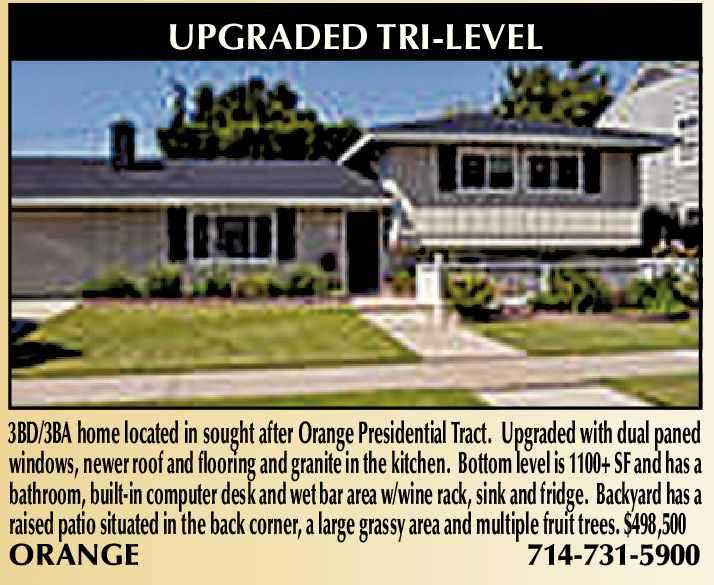 3BD/3BA home located in sought after Orange Presidential Tract. Upgraded with dual paned windows, newer roof and flooring and granite in the kitchen. Bottom level is 1100+ SF and has a bathroom, built-in computer desk and wet bar area w/wine rack, sink and fridge. Backyard has a raised patio situated in the back corner, a large grassy area and multiple fruit trees. $498,500 ORANGE 714-731-5900 UPGRADED TRI-LEVEL