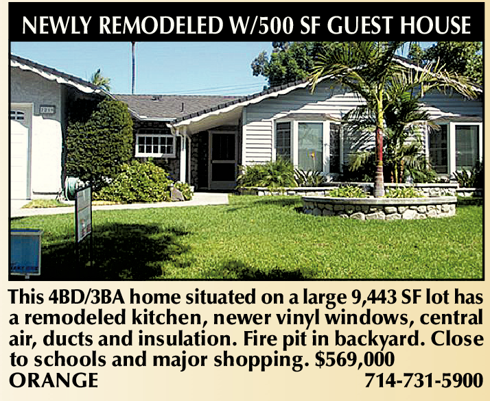 This 4BD/3BA home situated on a large 9,443 SF lot has a remodeled kitchen, newer vinyl windows, central air, ducts and insulation. Fire pit in backyard. Close to schools and major shopping. $569,000 ORANGE 714-731-5900