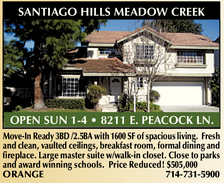 OPEN SUN 1-4 • 8211 E. PEACOCK LN. Move-In Ready 3BD /2.5BA with 1600 SF of spacious living. Fresh and clean, vaulted ceilings, breakfast room, formal dining and fireplace. Large master suite w/walk-in closet. Close to parks and award winning schools. Price Reduced! $505,000 ORANGE 714-731-5900 SANTIAGO HILLS MEADOW CREEK