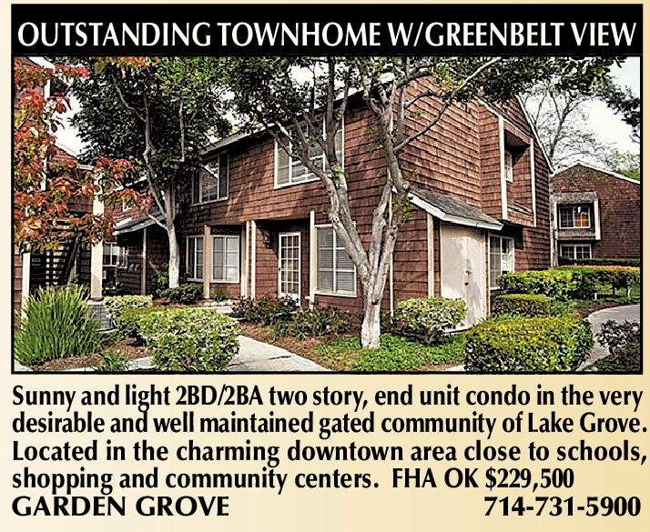OUTSTANDING TOWNHOME W/GREENBELT VIEW Sunny and light 2BD/2BA two story, end unit condo in the very desirable and well maintained gated community of Lake Grove. Located in the charming downtown area close to schools, shopping and community centers. FHA OK $229,500 GARDEN GROVE 714-731-5900