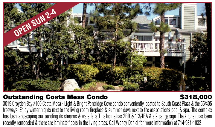 Outstanding Costa Mesa Condo $318,000 3019 Croyden Bay #100 Costa Mesa - Light & Bright Pentridge Cove condo conveniently located to South Coast Plaza & the 55/405 freeways. Enjoy winter nights next to the living room fireplace & summer days next to the associations pool & spa. The complex has lush landscaping surrounding its streams & waterfalls This home has 2BR & 1 3/4BA & a 2 car garage. The kitchen has been recently remodeled & there are laminate floors in the living areas. Call Wendy Daniel for more information at 714-931-1032