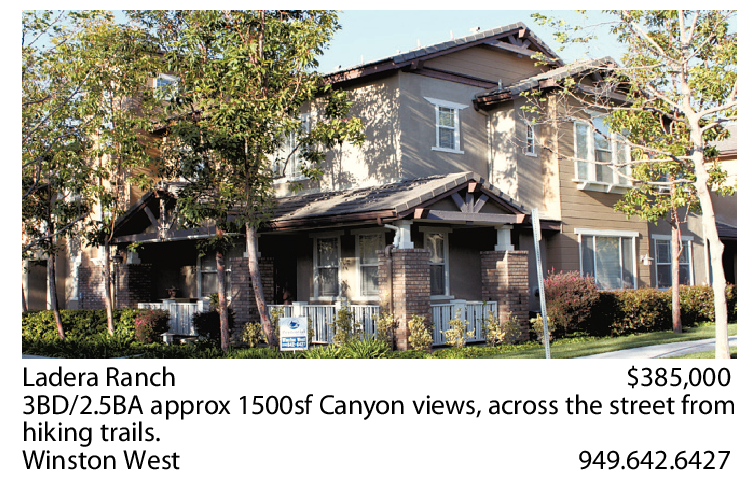 Ladera Ranch $385,000 3BD/2.5BA approx 1500sf Canyon views, across the street from hiking trails. Winston West 949.642.6427