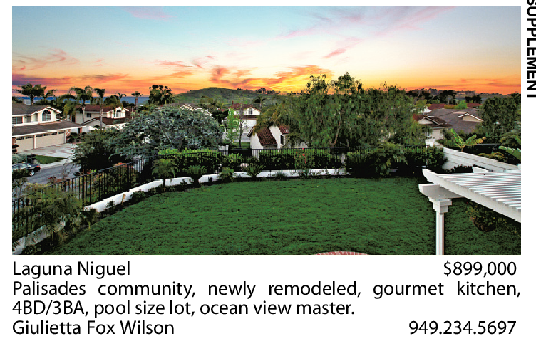 Laguna Niguel $899,000 Palisades community, newly remodeled, gourmet kitchen, 4BD/3BA, pool size lot, ocean view master. Giulietta Fox Wilson 949.234.5697