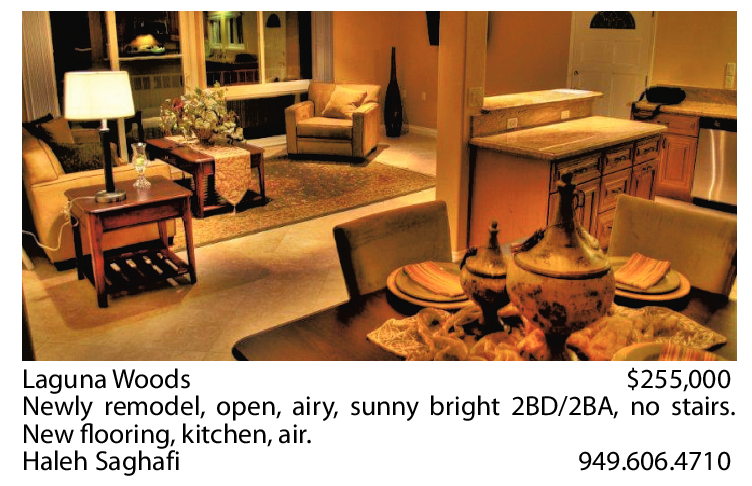 Laguna Woods $255,000 Newly remodel, open, airy, sunny bright 2BD/2BA, no stairs. New flooring, kitchen, air. Haleh Saghafi 949.606.4710