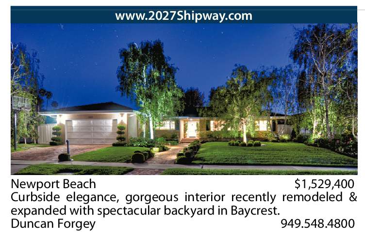 Newport Beach $1,529,400 Curbside elegance, gorgeous interior recently remodeled & expanded with spectacular backyard in Baycrest. Duncan Forgey 949.548.4800
