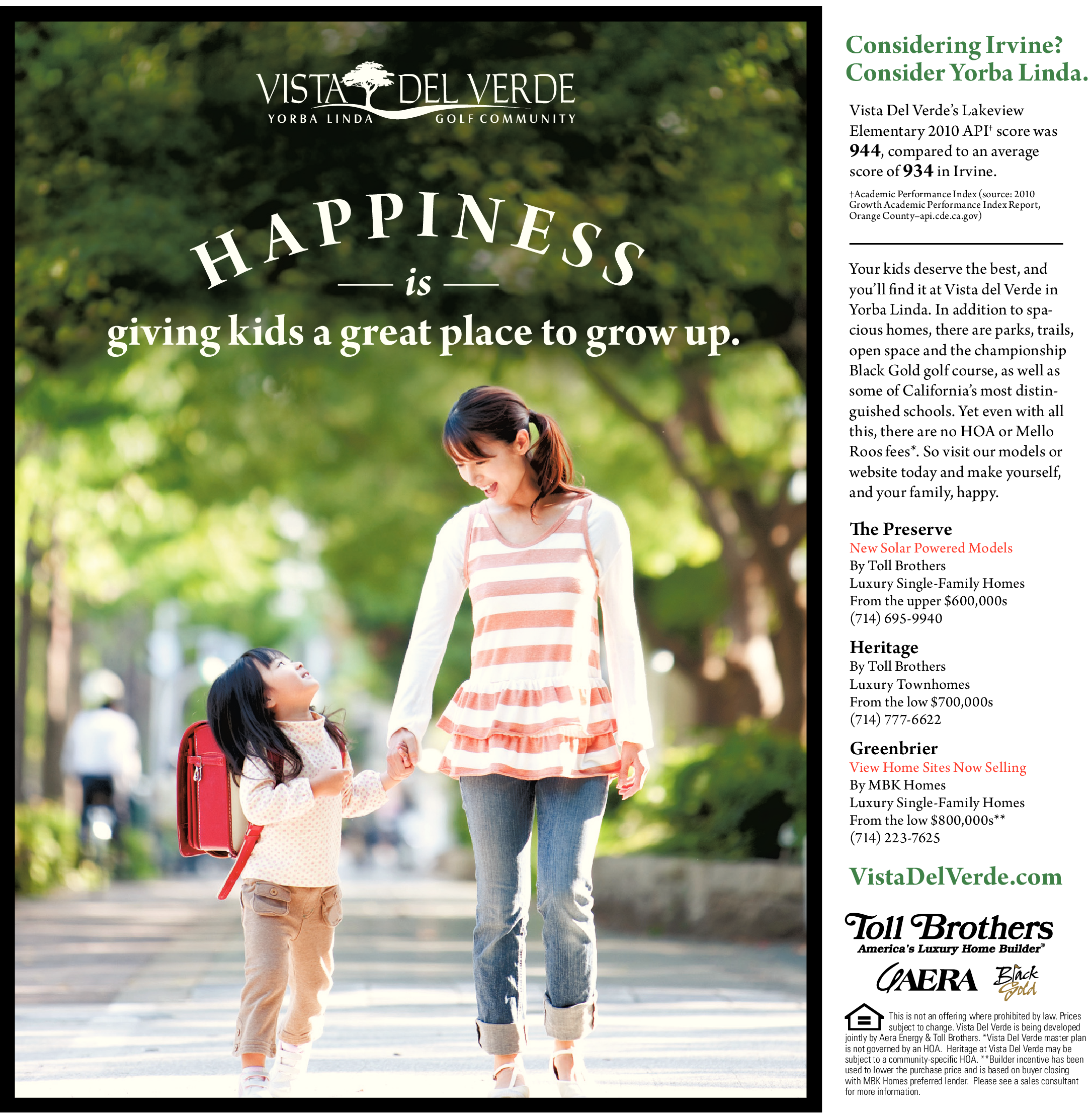 Your kids deserve the best, and you’ll find it at Vista del Verde in Yorba Linda. In addition to spacious homes, there are parks, trails, open space and the championship Black Gold golf course, as well as some of California’s most distinguished schools. Yet even with all this, there are no HOA or Mello Roos fees*. So visit our models or website today and make yourself, and your family, happy.