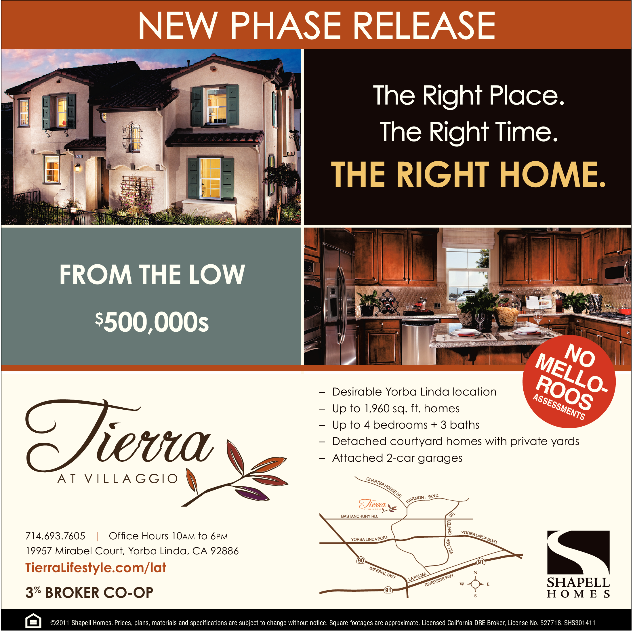 FROM THE LOW $ 500,000s 714.693.7605 | Office Hours 10AM to 6PM 19957 Mirabel Court, Yorba Linda, CA 92886 TierraLifestyle.com/lat 3 % BROKER CO-OP NEW PHASE RELEASE The Right Place. The Right Time. THE RIGHT HOME. – Desirable Yorba Linda location – Up to 1,960 sq. ft. homes – Up to 4 bedrooms + 3 baths – Detached courtyard homes with private yards – Attached 2-car garages ©2011 Shapell Homes. Prices, plans, materials and specifications are subject to change without notice. Square footages are approximate. Licensed California DRE Broker, License No. 527718. SHS301411