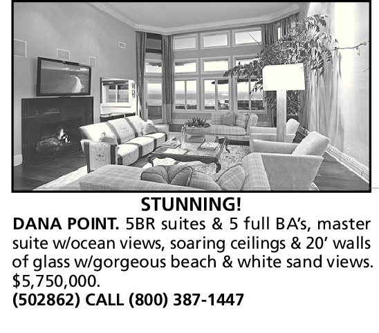 DANA POINT. 5BR suites & 5 full BA’s, master suite w/ocean views, soaring ceilings & 20’ walls of glass w/gorgeous beach & white sand views. $5,750,000. (502862) CALL (800) 387-1447