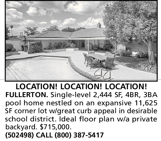 FULLERTON. Single-level 2,444 SF, 4BR, 3BA pool home nestled on an expansive 11,625 SF corner lot w/great curb appeal in desirable school district. Ideal floor plan w/a private backyard. $715,000. (502498) CALL (800) 387-5417