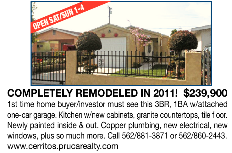 COMPLETELY REMODELED IN 2011! $239,900 1st time home buyer/investor must see this 3BR, 1BA w/attached one-car garage. Kitchen w/new cabinets, granite countertops, tile floor. Newly painted inside & out. Copper plumbing, new electrical, new windows, plus so much more. Call 562/881-3871 or 562/860-2443. www.cerritos.prucarealty.com
