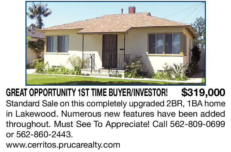 GREAT OPPORTUNITY 1ST TIME BUYER/INVESTOR! $319,000 Standard Sale on this completely upgraded 2BR, 1BA home in Lakewood. Numerous new features have been added throughout. Must See To Appreciate! Call 562-809-0699 or 562-860-2443. www.cerritos.prucarealty.com
