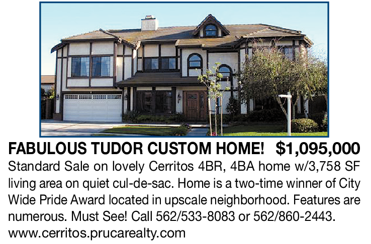 FABULOUS TUDOR CUSTOM HOME! $1,095,000 Standard Sale on lovely Cerritos 4BR, 4BA home w/3,758 SF living area on quiet cul-de-sac. Home is a two-time winner of City Wide Pride Award located in upscale neighborhood. Features are numerous. Must See! Call 562/533-8083 or 562/860-2443. www.cerritos.prucarealty.com