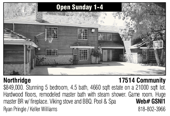 Northridge 17514 Community $849,000. Stunning 5 bedroom, 4.5 bath, 4660 sqft estate on a 21000 sqft lot. Hardwood floors, remodeled master bath with steam shower. Game room. Huge master BR w/ fireplace. Viking stove and BBQ. Pool & Spa Web# GSNI1 Ryan Pringle / Keller Williams 818-802-3966