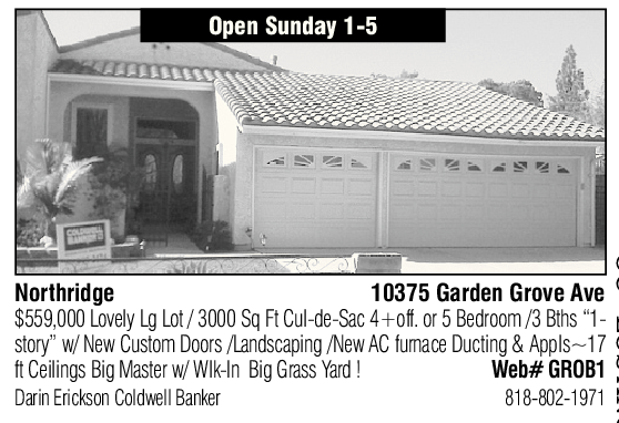 Northridge 10375 Garden Grove Ave $559,000 Lovely Lg Lot / 3000 Sq Ft Cul-de-Sac 4+off. or 5 Bedroom /3 Bths “1- story” w/ New Custom Doors /Landscaping /New AC furnace Ducting & Appls~17 ft Ceilings Big Master w/ Wlk-In Big Grass Yard ! Web# GROB1 Darin Erickson Coldwell Banker 818-802-1971