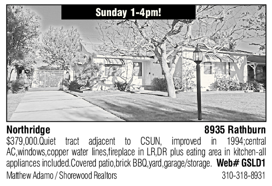 Northridge 8935 Rathburn $379,000.Quiet tract adjacent to CSUN, improved in 1994;central AC,windows,copper water lines,fireplace in LR,DR plus eating area in kitchen-all appliances included.Covered patio,brick BBQ,yard,garage/storage. Web# GSLD1 Matthew Adamo / Shorewood Realtors 310-318-8931