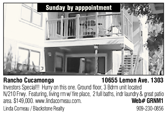 Rancho Cucamonga 10655 Lemon Ave. 1303 Investors Special!!! Hurry on this one. Ground floor, 3 Bdrm unit located N/210 Frwy. Featuring, living rm w/ fire place, 2 full baths, indr laundry & great patio area. $149,000. www.lindacomeau.com. Web# GRNM1 Linda Comeau / Blackstone Realty 909-230-0856