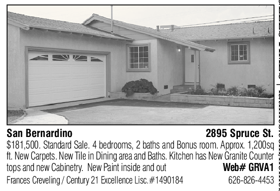 San Bernardino 2895 Spruce St. $181,500. Standard Sale. 4 bedrooms, 2 baths and Bonus room. Approx. 1,200sq ft. New Carpets. New Tile in Dining area and Baths. Kitchen has New Granite Counter tops and new Cabinetry. New Paint inside and out Web# GRVA1 Frances Creveling / Century 21 Excellence Lisc.#1490184 626-826-4453