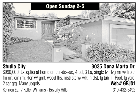 Studio City 3035 Dona Marta Dr. $990,000. Exceptional home on cul-de-sac, 4 bd, 3 ba, single lvl, lvg rm w/ frplc, fm rm, din rm, ktcn w/ grnt, wood flrs, mstr ste w/ wlk in clst, lg tub + Pool, lg yard, 2 car grg. Many upgrds. Web# GRJS1 Kennon Earl / Keller Williams - Beverly Hills 310-432-6492
