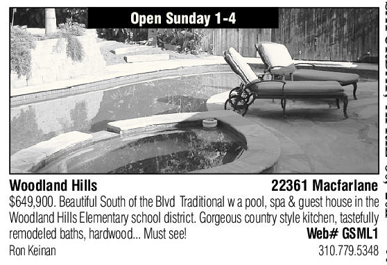 Woodland Hills 22361 Macfarlane $649,900. Beautiful South of the Blvd Traditional w a pool, spa & guest house in the Woodland Hills Elementary school district. Gorgeous country style kitchen, tastefully remodeled baths, hardwood... Must see! Web# GSML1 Ron Keinan 310.779.5348 15