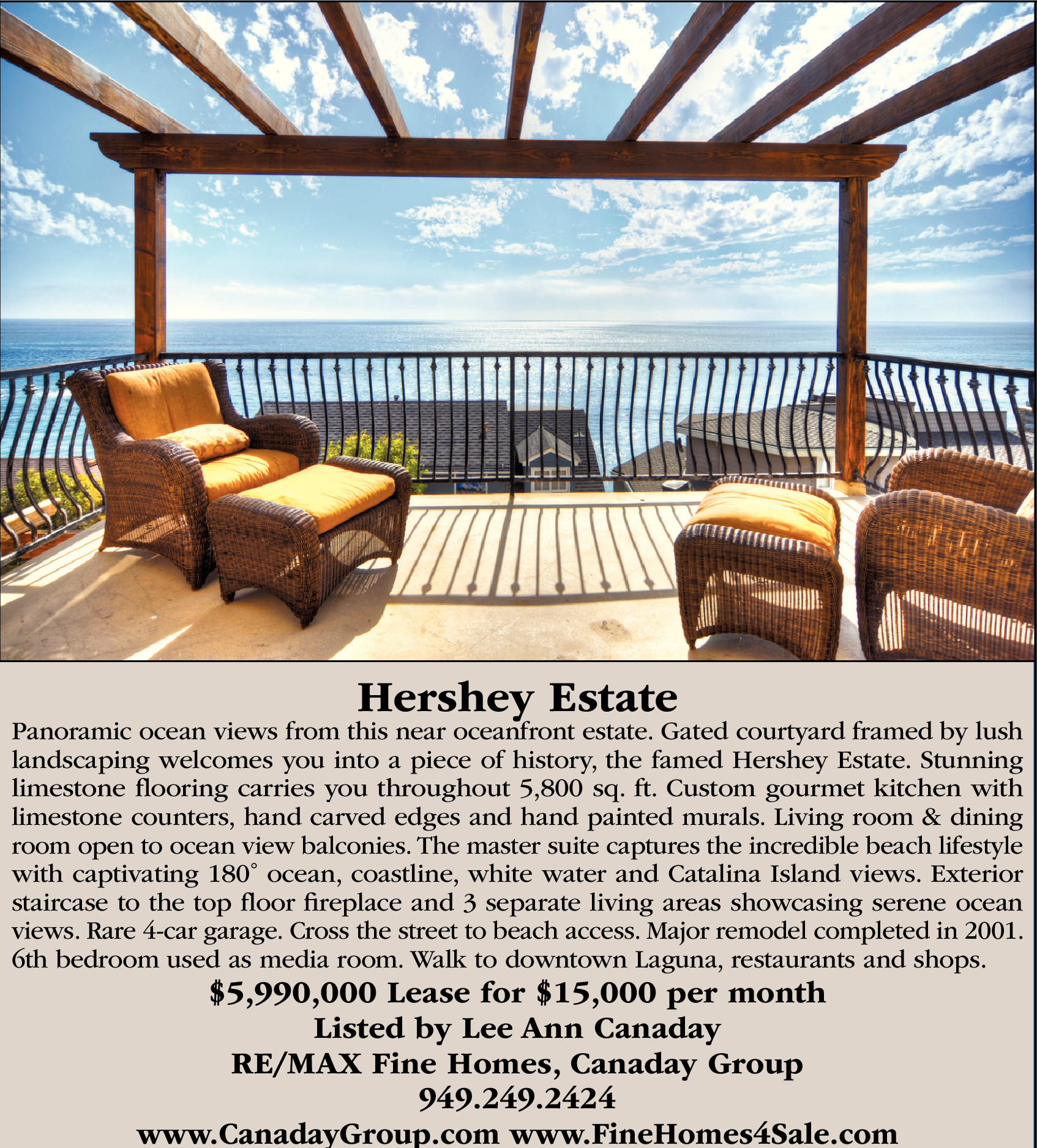 $5,990,000 Lease for $15,000 per month Listed by Lee Ann Canaday RE/MAX Fine Homes, Canaday Group 949.249.2424 www.CanadayGroup.com www.FineHomes4Sale.com