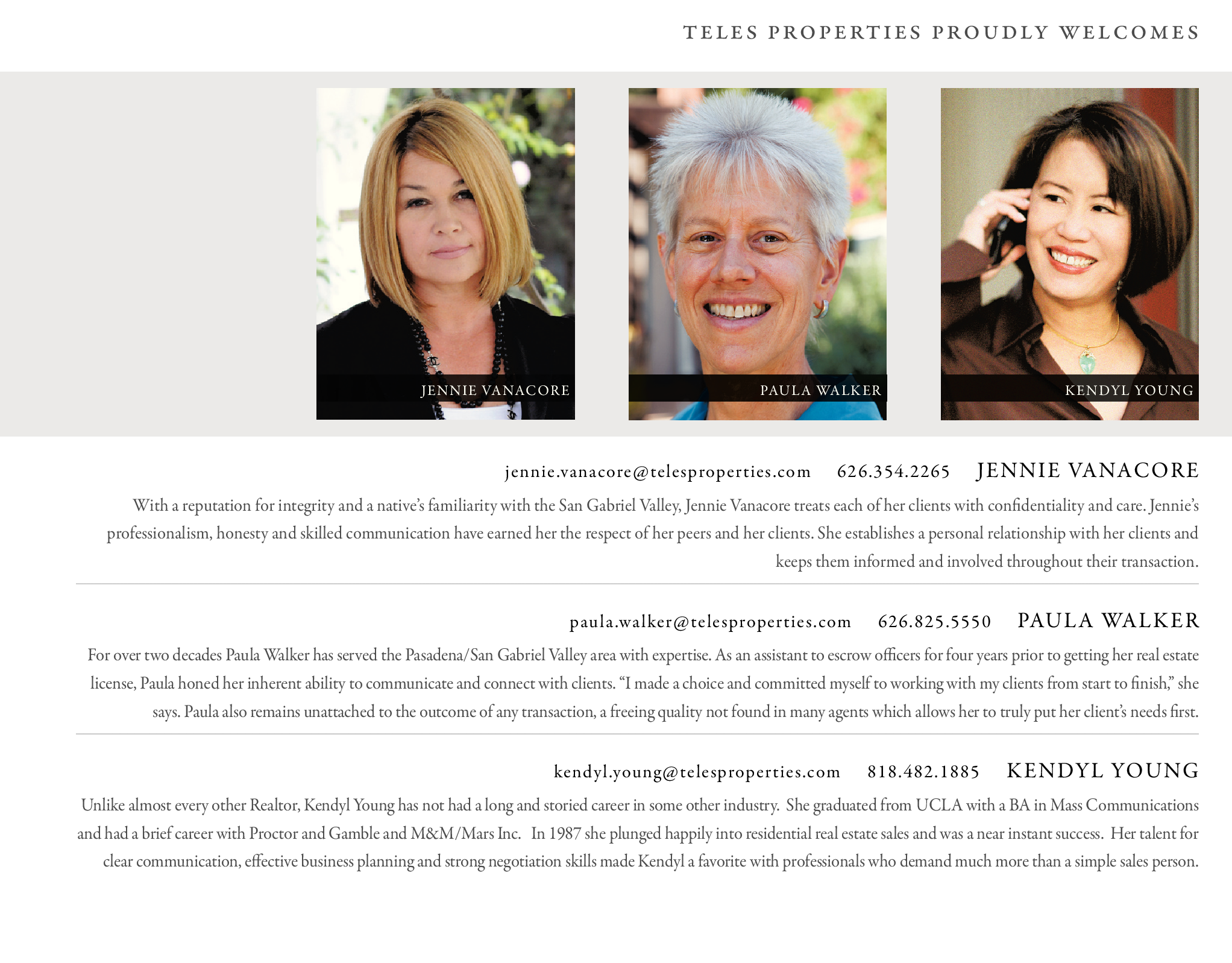 teles properties proudly welcomes JENNIE VANACORE PAULA WALK ER KENDYL YOUNG jennie.vanacore@telesproperties.com 626.354.2265 JENNIE VANACORE With a reputation for integrity and a native’s familiarity with the San Gabriel Valley, Jennie Vanacore treats each of her clients with confidentiality and care. Jennie’s professionalism, honesty and skilled communication have earned her the respect of her peers and her clients. She establishes a personal relationship with her clients and keeps them informed and involved throughout their transaction. paula.walker@telesproperties.com 626.825.5550 PAULA WALK ER For over two decades Paula Walker has served the Pasadena/San Gabriel Valley area with expertise. As an assistant to escrow officers for four years prior to getting her real estate license, Paula honed her inherent ability to communicate and connect with clients. “I made a choice and committed myself to working with my clients from start to finish,” she says. Paula also remains unattached to the outcome of any transaction, a freeing quality not found in many agents which allows her to truly put her client’s needs first. kendyl.young@telesproperties.com 818.482.1885 KENDYL YOUNG Unlike almost every other Realtor, Kendyl Young has not had a long and storied career in some other industry. She graduated from UCLA with a BA in Mass Communications and had a brief career with Proctor and Gamble and M&M/Mars Inc. In 1987 she plunged happily into residential real estate sales and was a near instant success. Her talent for clear communication, effective business planning and strong negotiation skills made Kendyl a favorite with professionals who demand much more than a simple sales person. See also