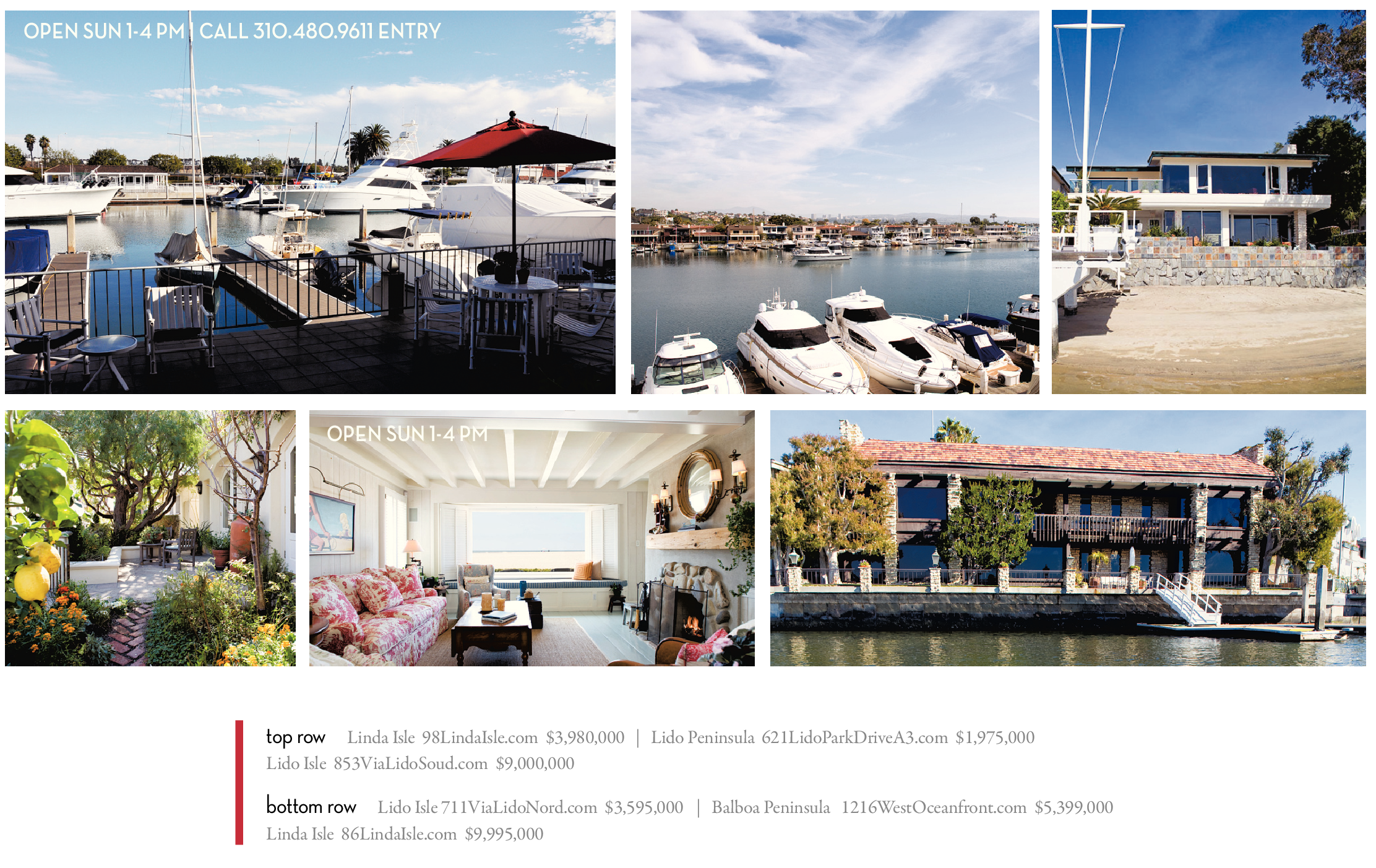 Lido Isle 711ViaLidoNord.com $3,595,000 | Balboa Peninsula 1216WestOceanfront.com $5,399,000 Linda Isle 86LindaIsle.com $9,995,000