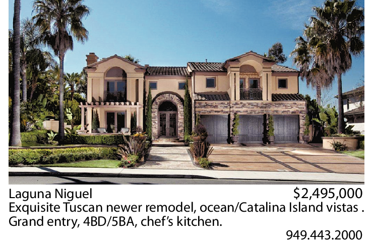 Laguna Niguel $2,495,000 Exquisite Tuscan newer remodel, ocean/Catalina Island vistas . Grand entry, 4BD/5BA, chef’s kitchen.