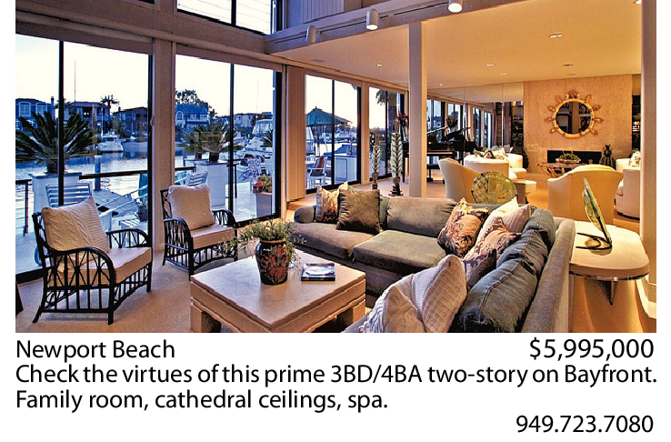 Newport Beach $5,995,000 Check the virtues of this prime 3BD/4BA two-story on Bayfront. Family room, cathedral ceilings, spa.