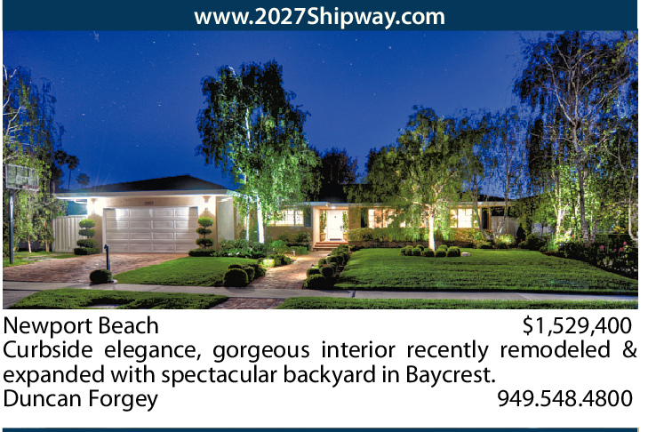 Newport Beach $1,529,400 Curbside elegance, gorgeous interior recently remodeled & expanded with spectacular backyard in Baycrest. Duncan Forgey 949.548.4800