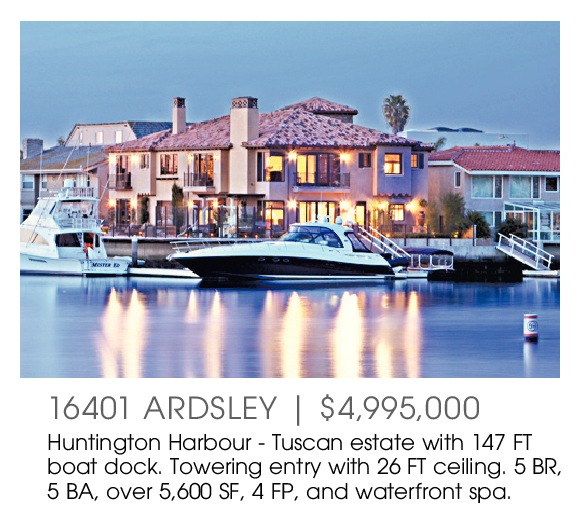 16401 ARDSLEY | $4,995,000 Huntington Harbour - Tuscan estate with 147 FT boat dock. Towering entry with 26 FT ceiling. 5 BR, 5 BA, over 5,600 SF, 4 FP, and waterfront spa.