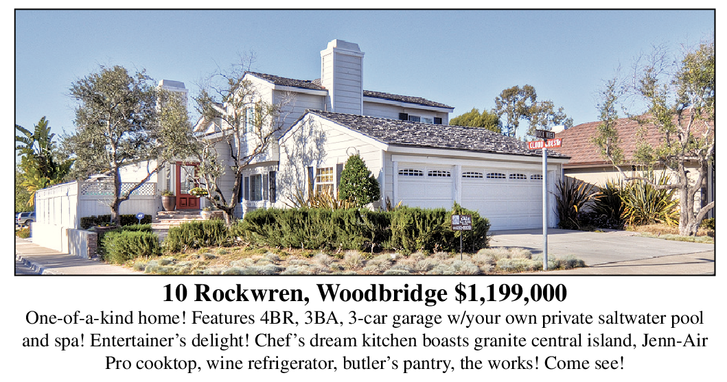 10 Rockwren, Woodbridge $1,199,000 One-of-a-kind home! Features 4BR, 3BA, 3-car garage w/your own private saltwater pool and spa! Entertainer’s delight! Chef’s dream kitchen boasts granite central island, Jenn-Air Pro cooktop, wine refrigerator, butler’s pantry, the works! Come see!