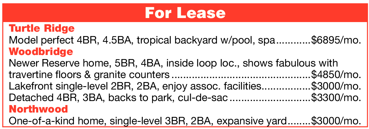 Turtle Ridge Model perfect 4BR, 4.5BA, tropical backyard w/pool, spa ............$6895/mo. Woodbridge Newer Reserve home, 5BR, 4BA, inside loop loc., shows fabulous with travertine floors & granite counters ................................................$4850/mo. Lakefront single-level 2BR, 2BA, enjoy assoc. facilities.................$3000/mo. Detached 4BR, 3BA, backs to park, cul-de-sac ............................$3300/mo. Northwood One-of-a-kind home, single-level 3BR, 2BA, expansive yard ........$3000/mo.
