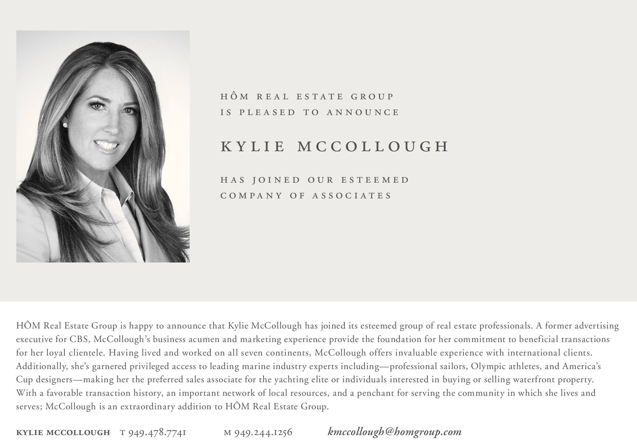 HÔM Real Estate Group is happy to announce that Kylie McCollough has joined its esteemed group of real estate professionals. A former advertising executive for CBS, McCollough’s business acumen and marketing experience provide the foundation for her commitment to beneficial transactions for her loyal clientele. Having lived and worked on all seven continents, McCollough offers invaluable experience with international clients. Additionally, she’s garnered privileged access to leading marine industry experts including—professional sailors, Olympic athletes, and America’s Cup designers—making her the preferred sales associate for the yachting elite or individuals interested in buying or selling waterfront property. With a favorable transaction history, an important network of local resources, and a penchant for serving the community in which she lives and serves; McCollough is an extraordinary addition to HÔM Real Estate Group.