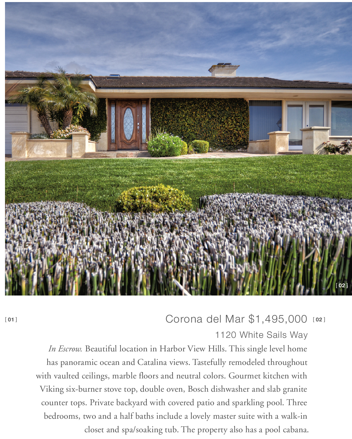 Beach. facilities. orchard. [ 01 ] Corona del Mar $1,495,000 1120 White Sails Way In Escrow. Beautiful location in Harbor View Hills. This single level home has panoramic ocean and Catalina views. Tastefully remodeled throughout with vaulted ceilings, marble floors and neutral colors. Gourmet kitchen with Viking six-burner stove top, double oven, Bosch dishwasher and slab granite counter tops. Private backyard with covered patio and sparkling pool. Three bedrooms, two and a half baths include a lovely master suite with a walk-in closet and spa/soaking tub. The property also has a pool cabana. [ 02 ] [ 02 ]