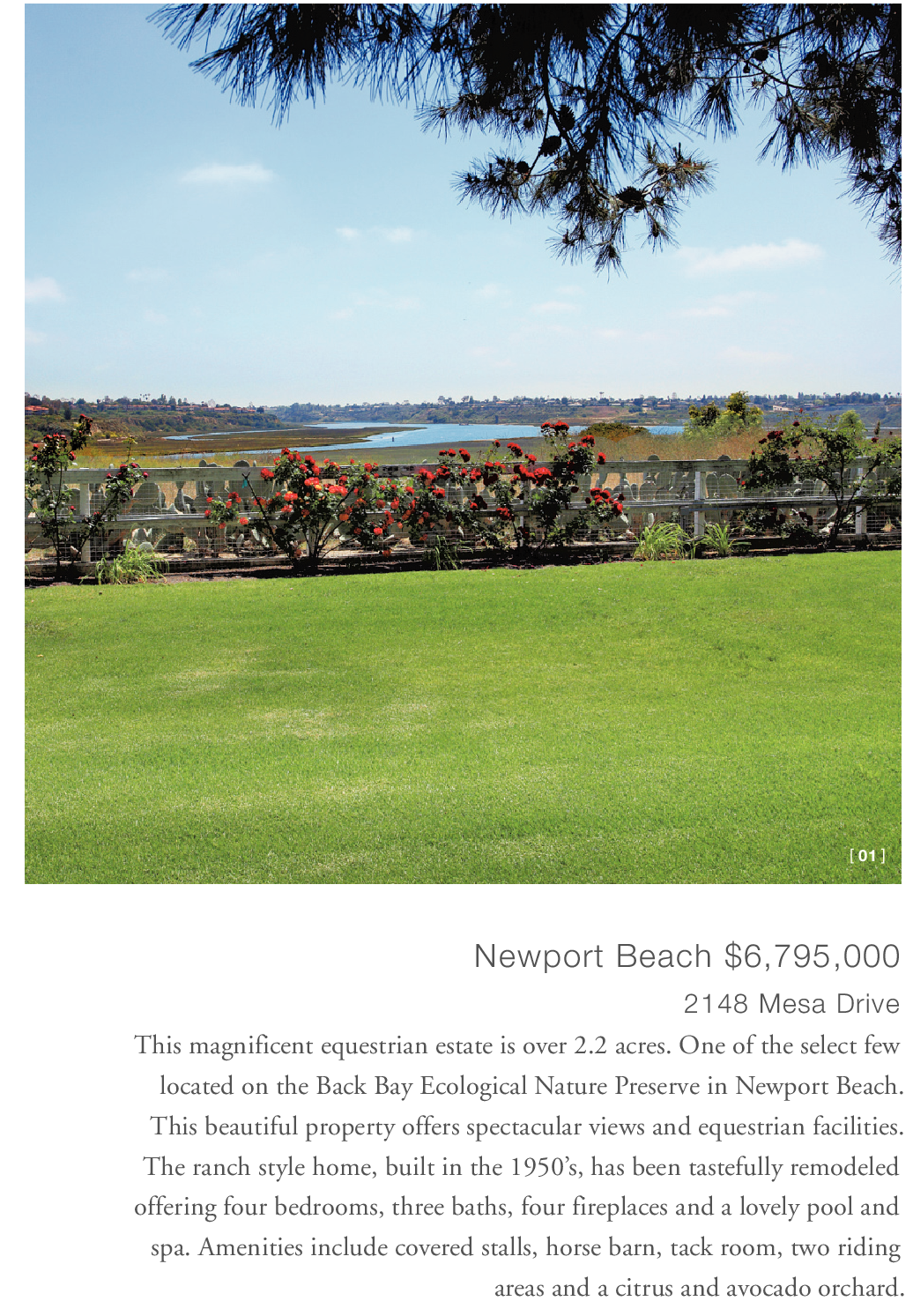 [ 01 ] Newport Beach $6,795,000 2148 Mesa Drive This magnificent equestrian estate is over 2.2 acres. One of the select few located on the Back Bay Ecological Nature Preserve in Newport Beach. This beautiful property offers spectacular views and equestrian facilities. The ranch style home, built in the 1950’s, has been tastefully remodeled offering four bedrooms, three baths, four fireplaces and a lovely pool and spa. Amenities include covered stalls, horse barn, tack room, two riding areas and a citrus and avocado orchard. See also