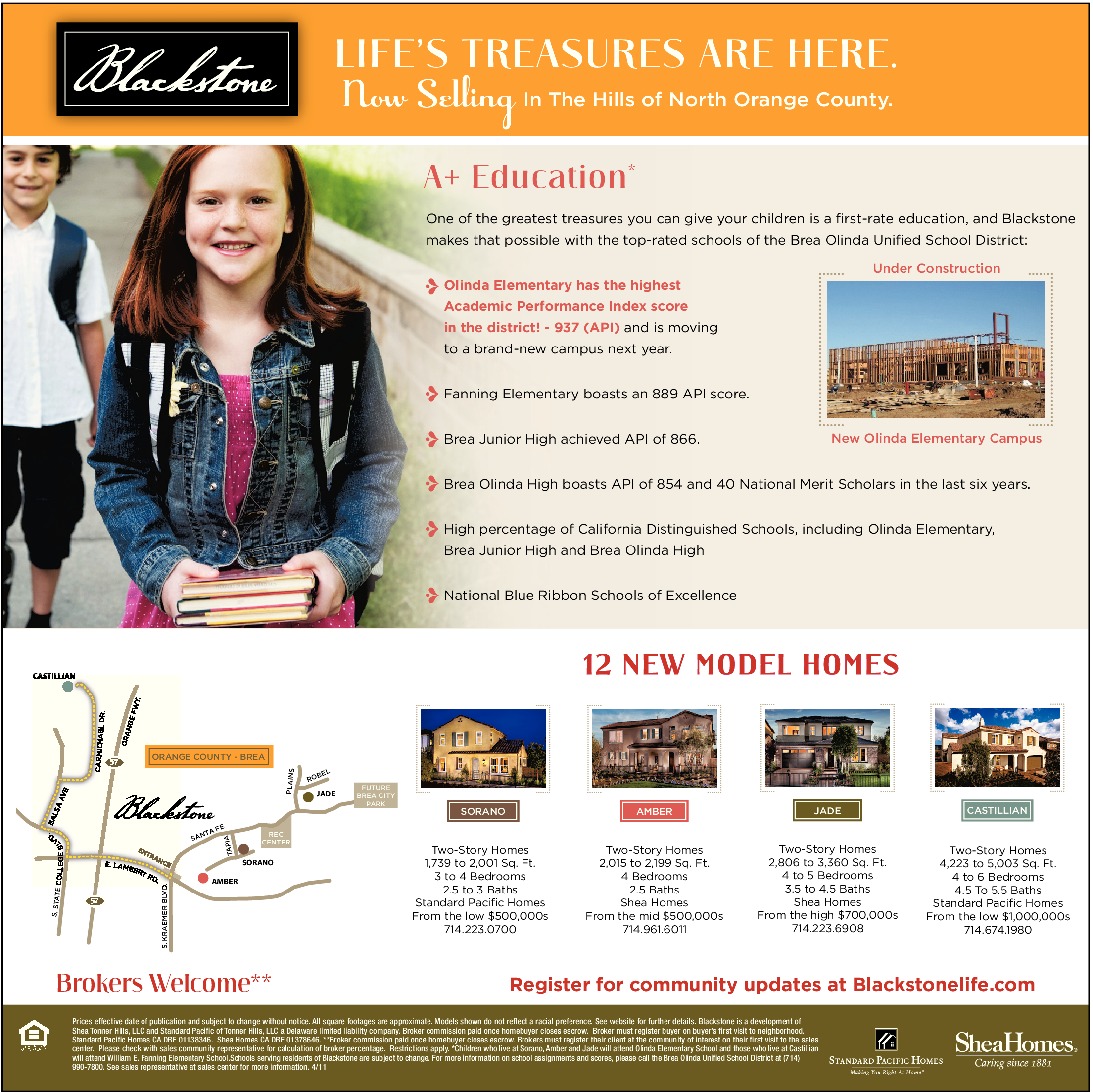 Prices effective date of publication and subject to change without notice. All square footages are approximate. Models shown do not reflect a racial preference. See website for further details. Blackstone is a development of Shea Tonner Hills, LLC and Standard Pacific of Tonner Hills, LLC a Delaware limited liability company. Broker commission paid once homebuyer closes escrow. Broker must register buyer on buyer’s first visit to neighborhood. Standard Pacific Homes CA DRE 01138346. Shea Homes CA DRE 01378646. **Broker commission paid once homebuyer closes escrow. Brokers must register their client at the community of interest on their first visit to the sales center. Please check with sales community representative for calculation of broker percentage. Restrictions apply. *Children who live at Sorano, Amber and Jade will attend Olinda Elementary School and those who live at Castillian will attend William E. Fanning Elementary School.Schools serving residents of Blackstone are subject to change. For more information on school assignments and scores, please call the Brea Olinda Unified School District at (714) 990-7800. See sales representative at sales center for more information. 4/11
