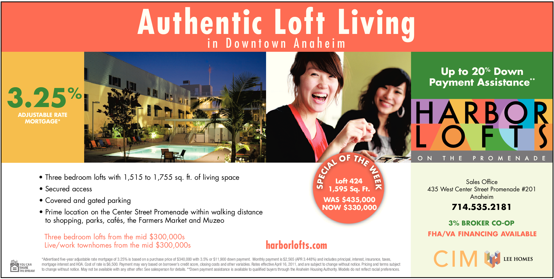 *Advertised five-year adjustable rate mortgage of 3.25% is based on a purchase price of $340,000 with 3.5% or $11,900 down payment. Monthly payment is $2,565 (APR 3.448%) and includes principal, interest, insurance, taxes, mortgage interest and HOA. Cost of rate is $6,500. Payment may vary based on borrower’s credit score, closing costs and other variables. Rates effective April 16, 2011, and are subject to change without notice. Pricing and terms subject to change without notice. May not be available with any other offer. See salesperson for details. **Down payment assistance is available to qualified buyers through the Anaheim Housing Authority. Models do not reflect racial preferences.