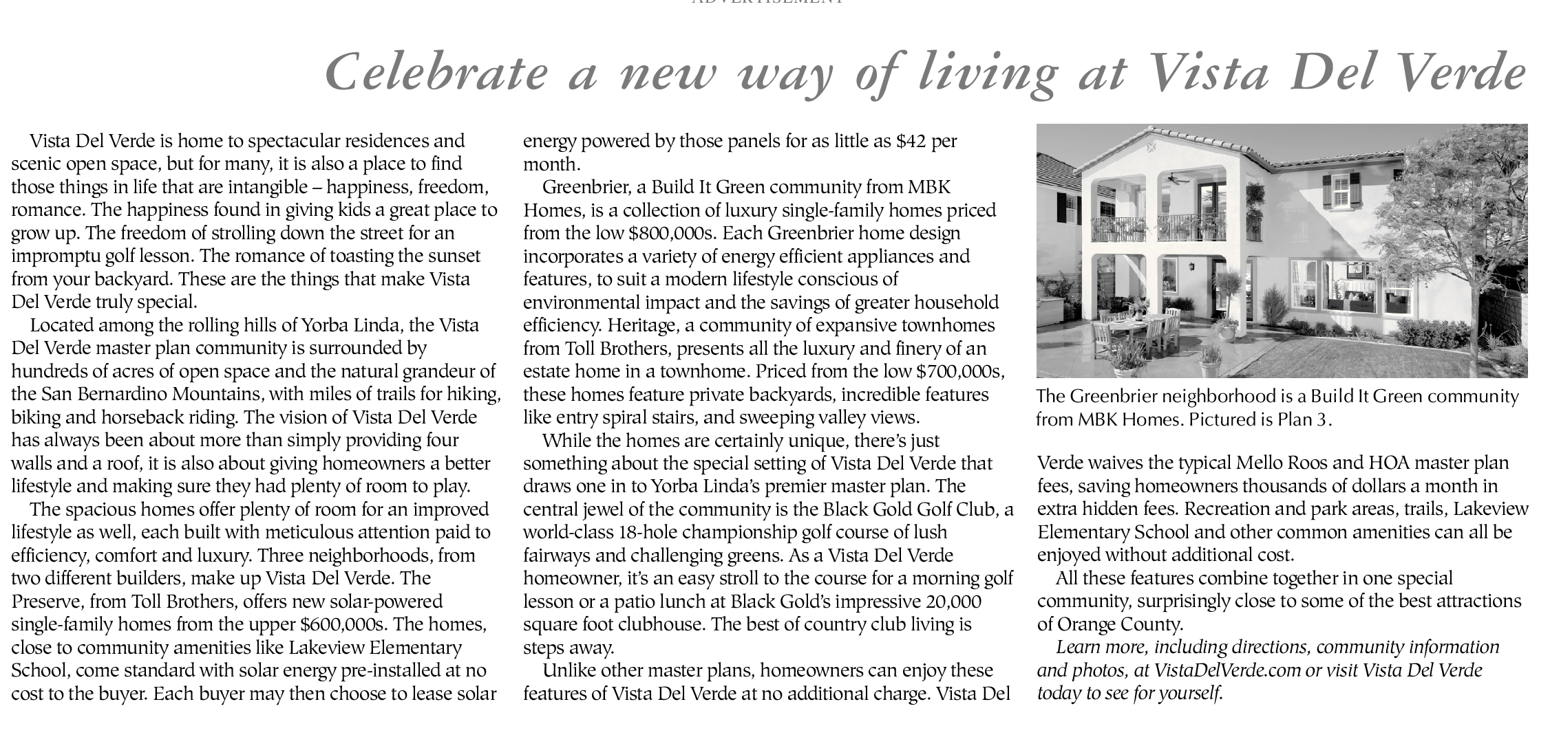 Located among the rolling hills of Yorba Linda, the Vista Del Verde master plan community is surrounded by hundreds of acres of open space and the natural grandeur of the San Bernardino Mountains, with miles of trails for hiking, biking and horseback riding. The vision of Vista Del Verde has always been about more than simply providing four walls and a roof, it is also about giving homeowners a better lifestyle and making sure they had plenty of room to play.